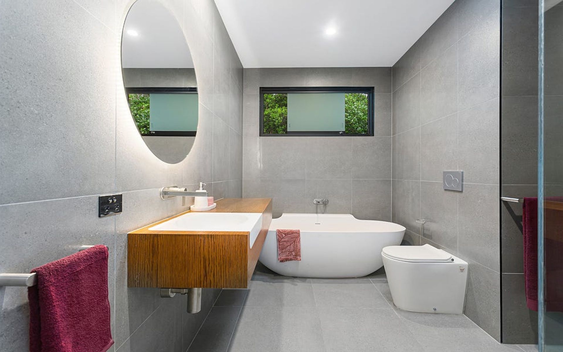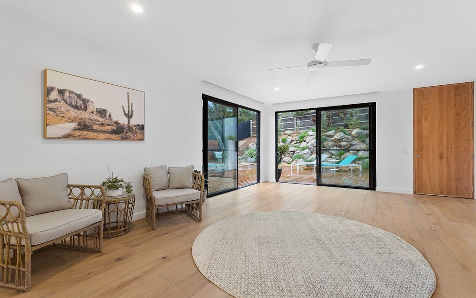 This home is designed to embrace its environment while offering a contemporary retreat. The layout prioritises openness and natural light, with large windows and strategically positioned living spaces that capture the surrounding landscape. A neutral, earthy material palette allows the home to sit harmoniously within its setting, enhancing its connection to the outdoors.